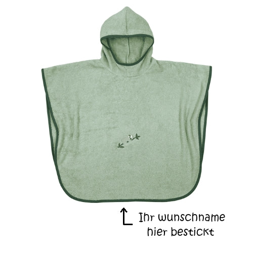 Nach dem Baden, Planschen oder Schwimmen lädt der Badeponcho mit süßem Faultier-Motiv in helloliv zum Einkuscheln ein. Die flauschige Frottierware aus reiner Baumwolle hält angenehm warm, nimmt Feuchtigkeit zuverlässig auf und bietet dank großzügigem Schnitt viel Bewegungsfreiheit. Gemeinsam mit dem passenden Waschhandschuh im gleichen Faultier-Design – ebenfalls liebevoll mit Namen bestickt – entsteht ein harmonisches Set, das kleine Wasserratten sanft trocknet und jeden Badetag entspannt ausklingen lässt.