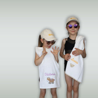 Eine süße Kombination. Ben Bär und Belle Biene kommen in dein Bad. Lass dein Badeponcho jetzt bei uns personalisieren. Auch super als Geschenk zum Geburtstag eines Kindes geeignet.